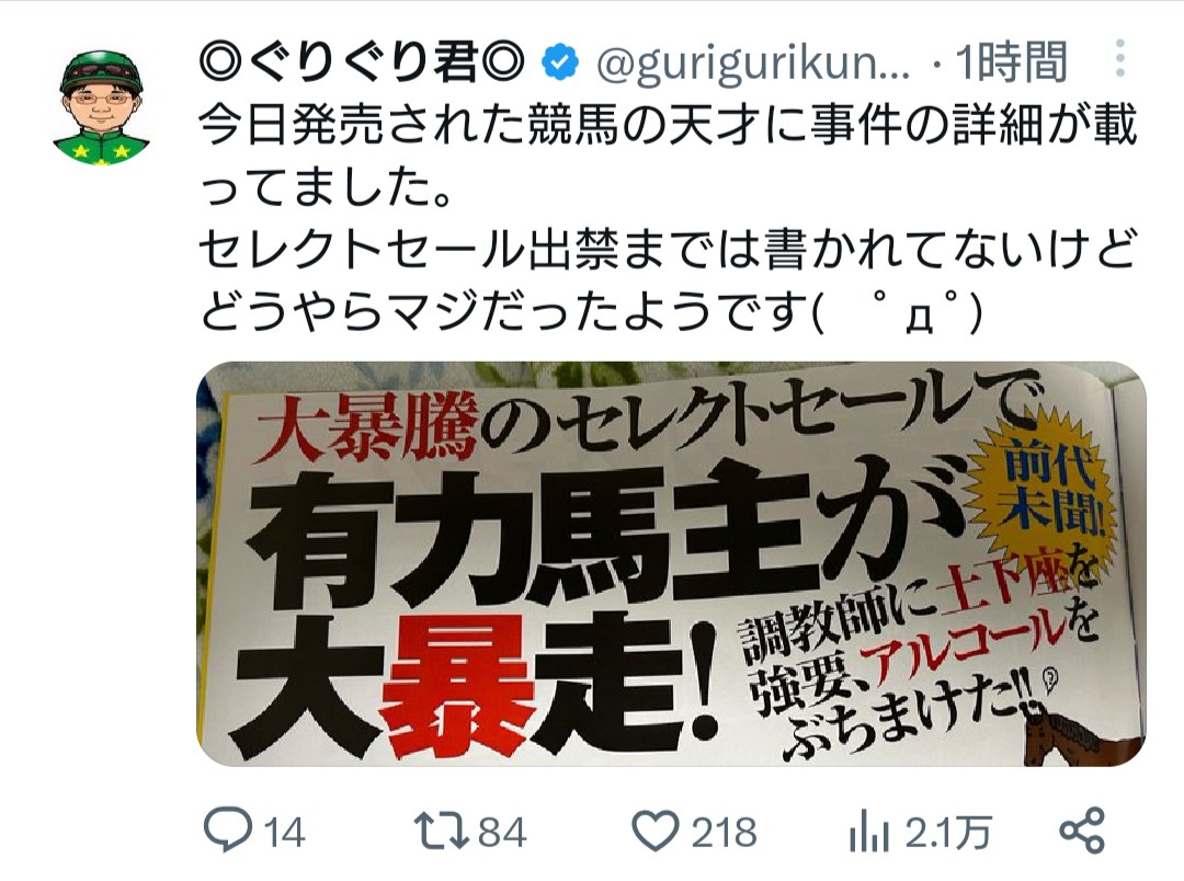 競馬ニュース2歳馬主オーナー西山オーナー、競馬界の闇に触れた馬主ぐりぐり君に警鐘「その件に触れるべきではない、削除して」 2023年8月16日 2023年8月16日therock0425 Facebook Twitter はてブ Pocket Feedly 1: 名無しさん@実況で競馬板アウト 2023/08/16(水) 20:01:25.17 ID:TJJ44+rZ0 ↓ ↓ ぐりぐり君、慌ててツイートを削除 続きを読む Source: ターフ速報-競馬まとめ- Facebook Twitter はてブ Pocket Feedly