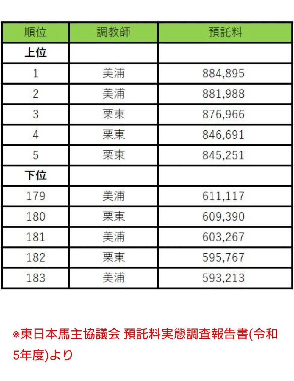 競馬ニュース2歳【JRA】厩舎別の預託料を公表 平均預託料は72万円最高値厩舎は88万円 2024年12月30日 2024年12月30日therock0425 Facebook Twitter はてブ Pocket Feedly 1: 名無しさん@実況で競馬板アウト 2024/12/29(日) 22:49:53.84 ID:xzOzdVCN0 JRA厩舎別預託料ランキング2023年 最高額は月88万円 JRAトレセン厩舎別の月平均預託料(上位5、下位5) 令和5年度平均預託料(1頭1ヶ月あたり) 美浦:724531円 栗東:712826円 続きを読む Source: ☆うまなみ・競馬にゅーす速報 Facebook Twitter はてブ Pocket Feedly