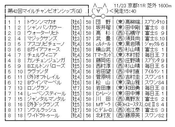 競馬ニュース2歳【競馬予想】[5] 第42回マイルチャンピオンシップ(GⅠ) /2025 2025年11月22日 2025年11月22日therock0425 Facebook Twitter はてブ Pocket Feedly 2: 名無しさん@実況で競馬板アウト (ワッチョイW fee1-O7aY) 2025/11/22(土) 05:58:38.52 ID:OAlTZWmO0 続きを読む Source: ☆うまなみ・競馬にゅーす速報 Facebook Twitter はてブ Pocket Feedly