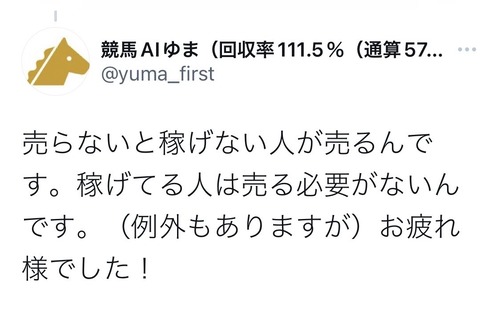 競馬ニュース2歳レース競馬AIゆま「本当に稼げてる人は有料予想なんてやらない。自分は死んでも有料化しません」 2022年8月8日 2022年8月8日therock0425 Facebook Twitter はてブ Pocket Feedly 1:名無しさん@実況で競馬板アウト:2022/08/05(金) 20:15:38.09 ID:19vCNZa00.net 競馬AIゆま(回収率111.5%(通算57698レース))@yuma_first 売らないと稼げない人が売るんです。稼げてる人は売る必要がないんです。(例外もありますが)お疲れ様でした! 続きを読む Source: ターフ速報-競馬まとめ- Facebook Twitter はてブ Pocket Feedly