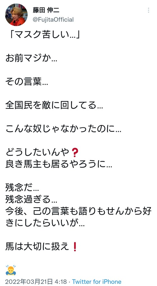 競馬ニュース2歳藤田伸二が岩田に苦言「全国民を敵に回してる…こんな奴じゃなかったのに…どうしたいんや? 残念だ」 2022年3月23日 2022年3月23日therock0425 Facebook Twitter はてブ Pocket Feedly 1:名無しさん@実況で競馬板アウト:2022/03/21(月) 23:43:50.03 ID:7iq/fA8g0.net 藤田伸二の岩田康誠へのツイート 3月19日 3月20日 3月21日 続きを読む Source: ターフ速報-競馬まとめ- Facebook Twitter はてブ Pocket Feedly