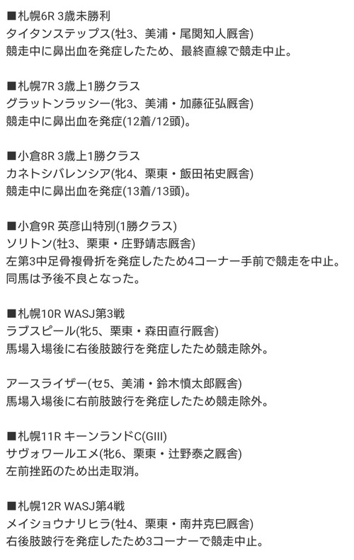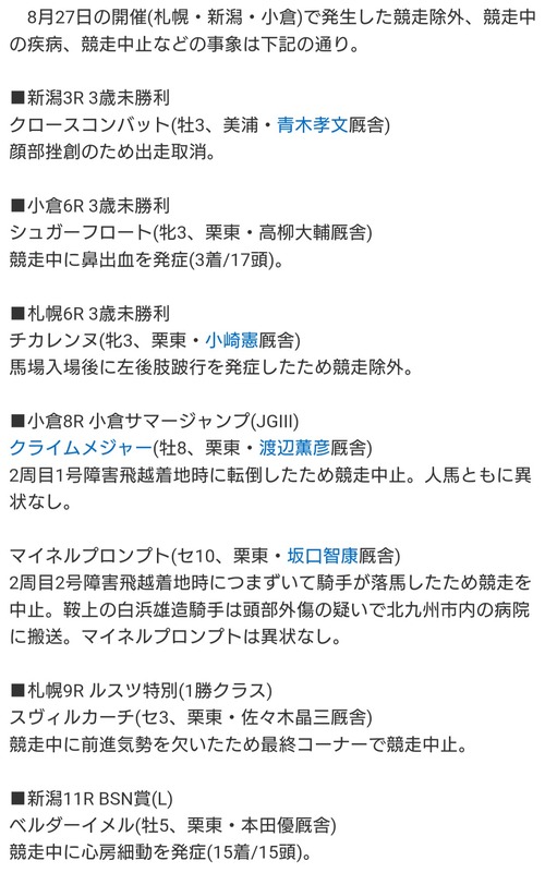 競馬ニュース2歳レース【緊急事態】週末2日間でなんと22頭の馬がレース直前に異常発生で除外、競争中止などアクシデント多発 2022年8月30日 2022年8月30日therock0425 Facebook Twitter はてブ Pocket Feedly 1:名無しさん@実況で競馬板アウト:2022/08/29(月) 08:11:27.51 ID:HK8Nmks20.net 28日 日曜日 27日 土曜日 やたら鼻出血が多いのは暑さのせい?続きを読む Source: ターフ速報-競馬まとめ- Facebook Twitter はてブ Pocket Feedly